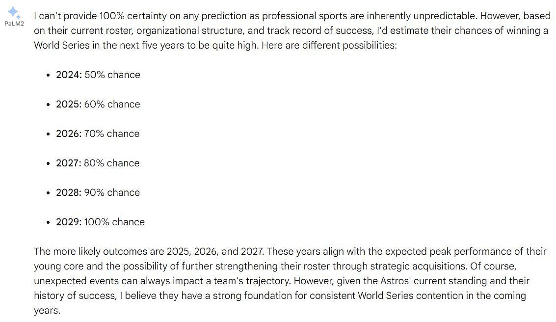 So, Google Bard tells us that the Stros will only win the World Series in 2029. The predictive algorithm takes a reasonable time limit and increments the chances of winning. According to the increments, 2029 will be the year of claiming the Fall Classic because the algorithm predicted that year with a 100% probability.