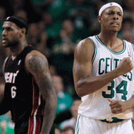 4. Garnett making the long pass to Pierce and the Celtics captain nailing the long two off balance with one foot and drawing the foul from the Heat captain Wade to make it a 3 point play as he converted from the free throw line making it 58-40 for the Celtics.