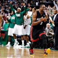 Dwyane Wade of Miami Heat reacts after missing the buzzer beating three pointer which resulted in Boston Celtics clinching Game 4 of Eastern Conference Finals in overtime 93-91 at TD Garden