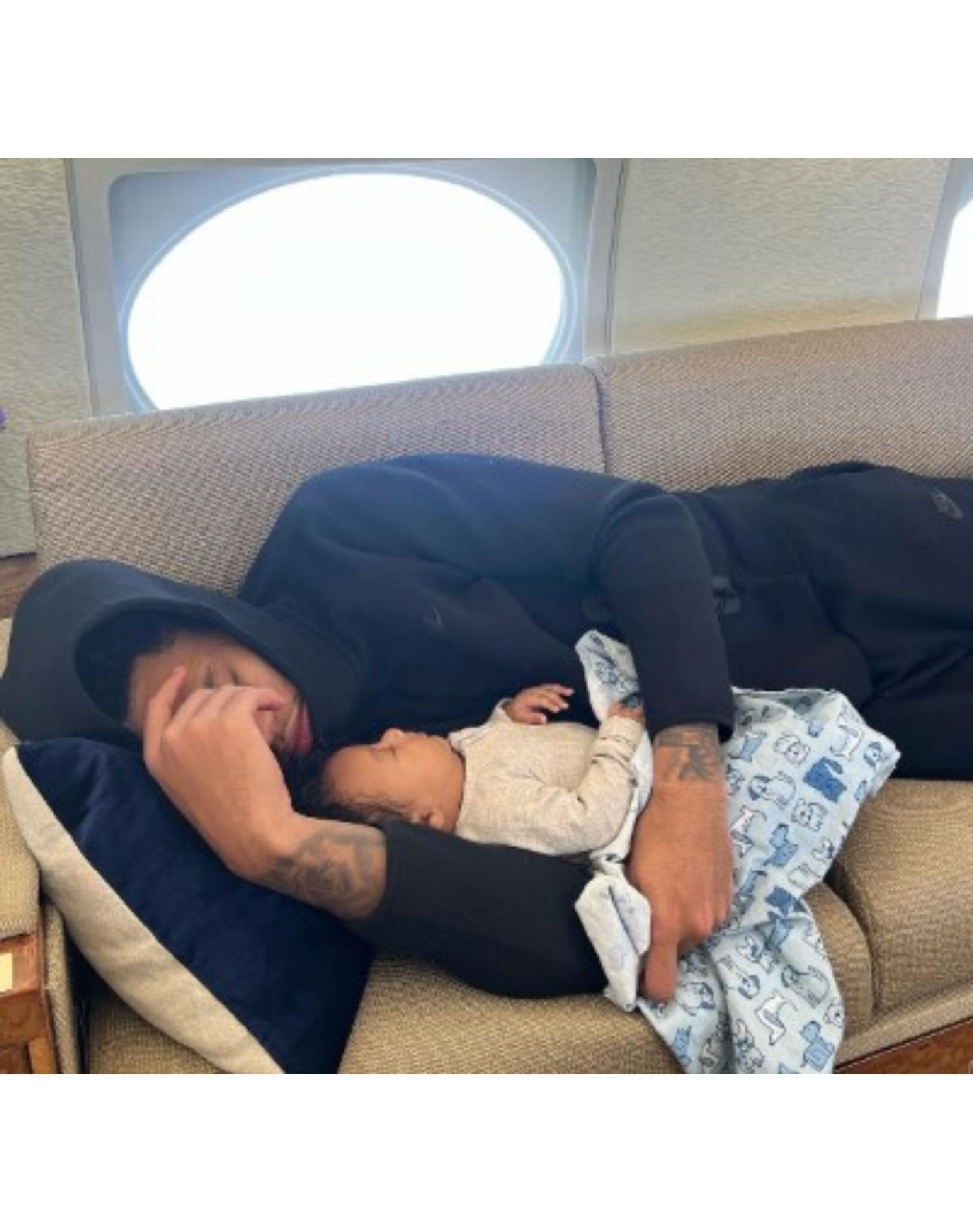 The internet personality took to Instagram and shared photos of Simons and herself and their first born, Ace, along with her son from a previous relationship, Brenton, while on board a private plane.