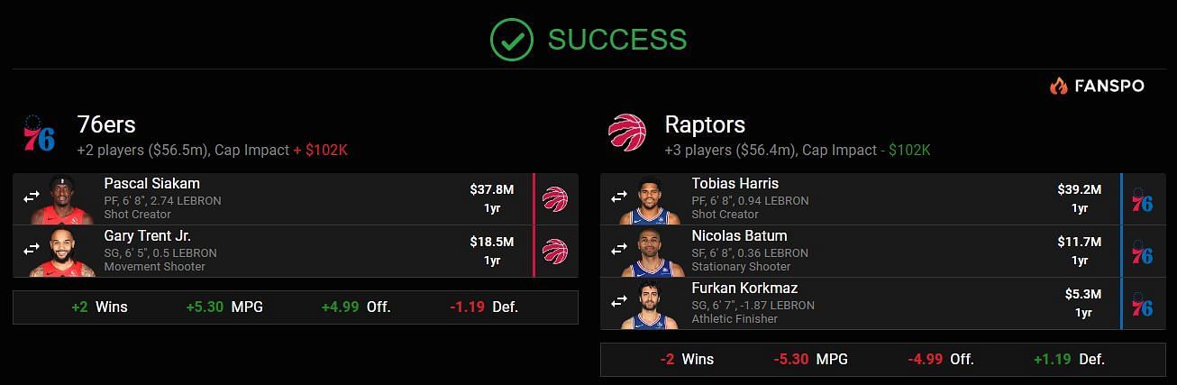 The proposed trade below has Gary Trent Jr. coming from the Raptors as well, while Harris, Nicolas Batum and Furkan Korkmaz heading the other way. It's not as enticing without a first-round pick and a few second-rounders. Siakam is on an expiring deal, so the Sixers will have to ensure that he re-signs with them.
