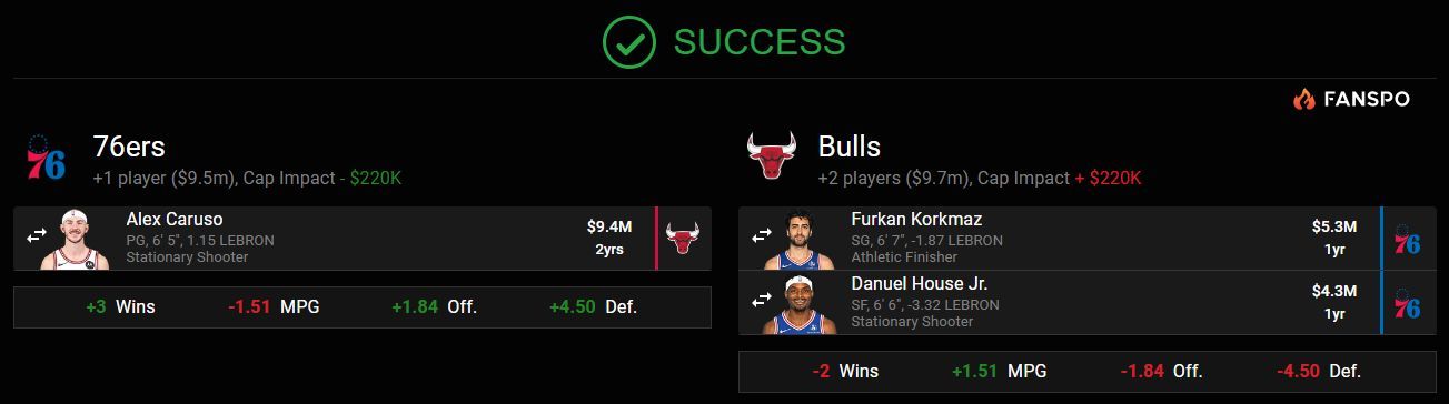 Philly could offer a package of Furkan Korkmaz, Danuel House Jr., a first-round pick and a couple of second-rounders. The Bulls could finally start a rebuild, while the Sixers get a perimeter defender who can guard multiple positions.