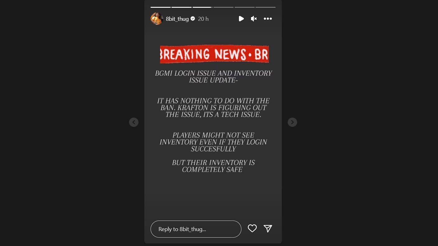 Meanwhile, S8UL's co-owner, 8bit Thug, also uploaded stories that focused on the same topic. He mentioned that the ongoing inventory problem will continue for some time. Players might now see their inventory even if they log into the title successfully.