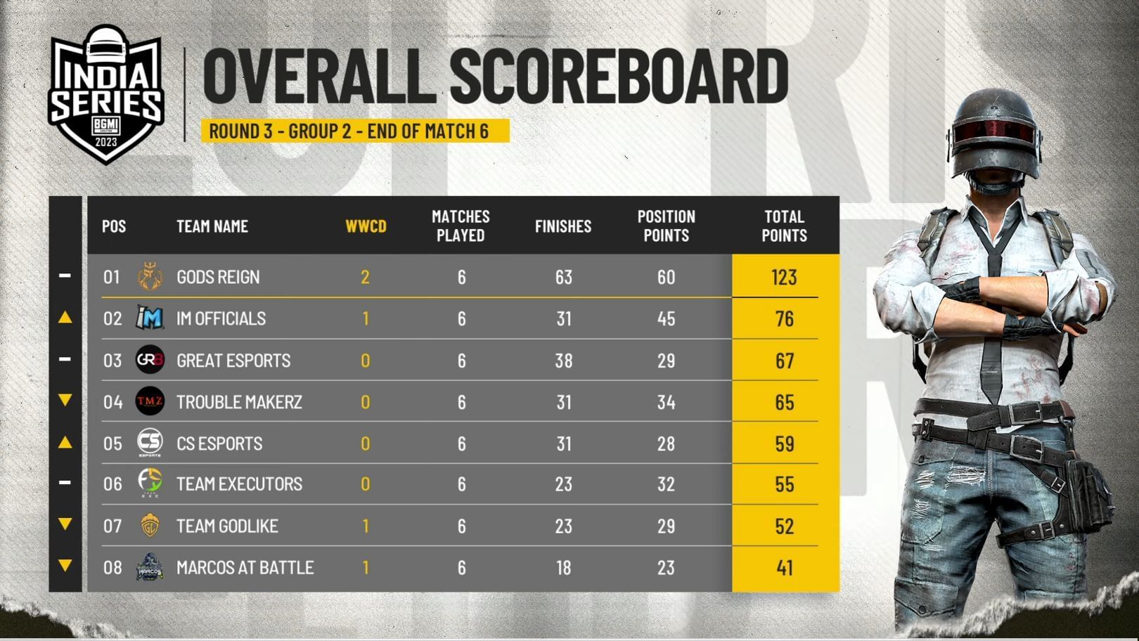 The side had a poor show on Day 2 as they added only 10 points in their last three matches. Gods Reign exhibited an absolute dominance in Group 2, amassing 123 points. 1M Officials and Great Esports occupied second and third seats, respectively. Trouble Makerz was fourth in this group with 65 points.
