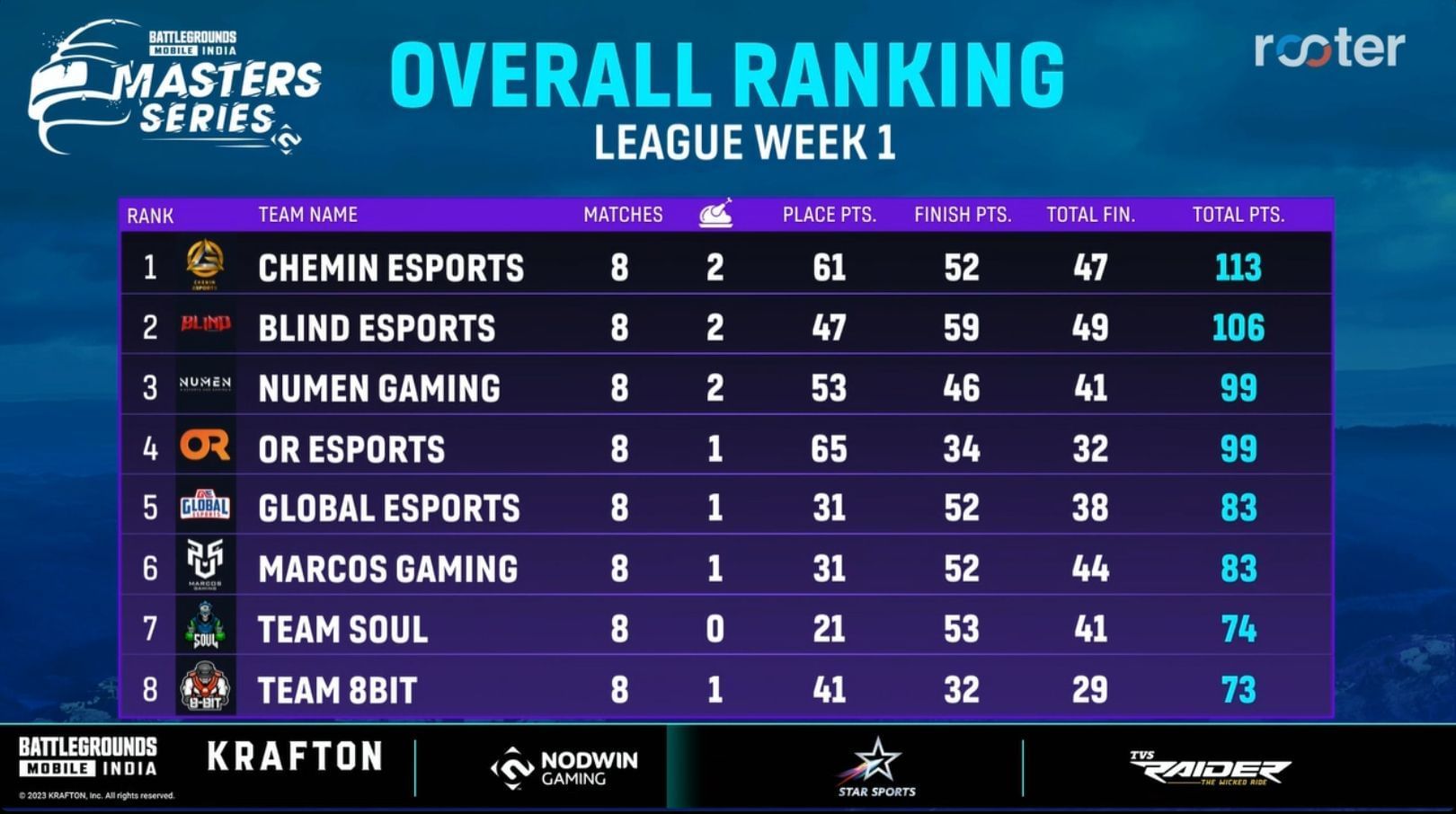 League Week 1 of the BGMS Season 2 wrapped up on August 11, with its top 16 squads reaching the BGMI Masters Series Super Weekend 1. Chemin Esports was the table topper with 113 points, while Blind Esports and Numen were the second and third-best squads with 106 and 99 points, respectively. Each participant played eight matches in Week 1.