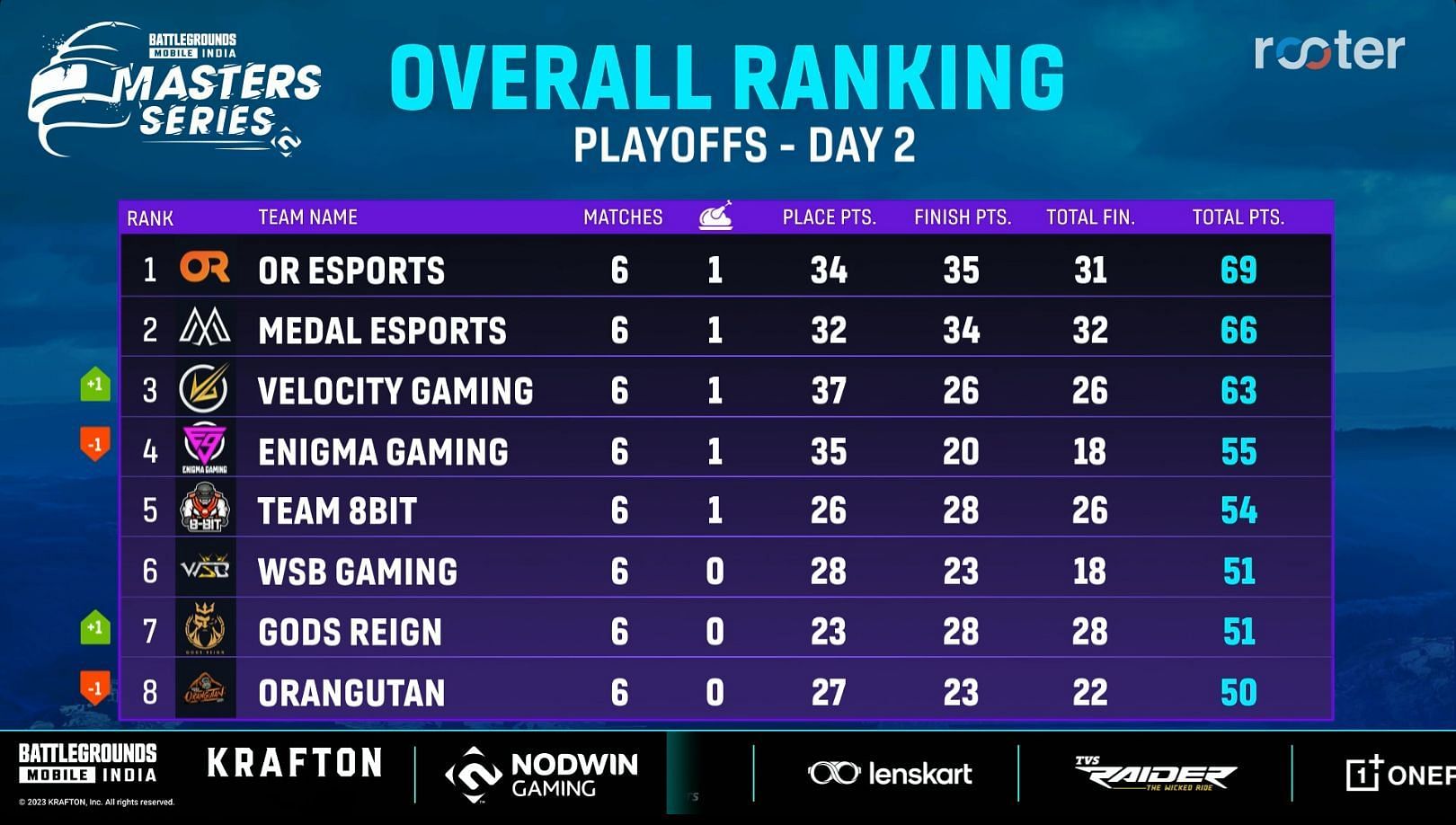 OR Esports accumulated 69 points throughout the Playoffs, while Medal Esports and Velocity were behind them with 66 and 63 points, respectively. WSB and Gods Reign ended up in sixth and seventh places with 51 points each. Oneblade and Gladiators managed to conclude the BGMS Playoff into the top 12 after completing brilliantly in the last match.