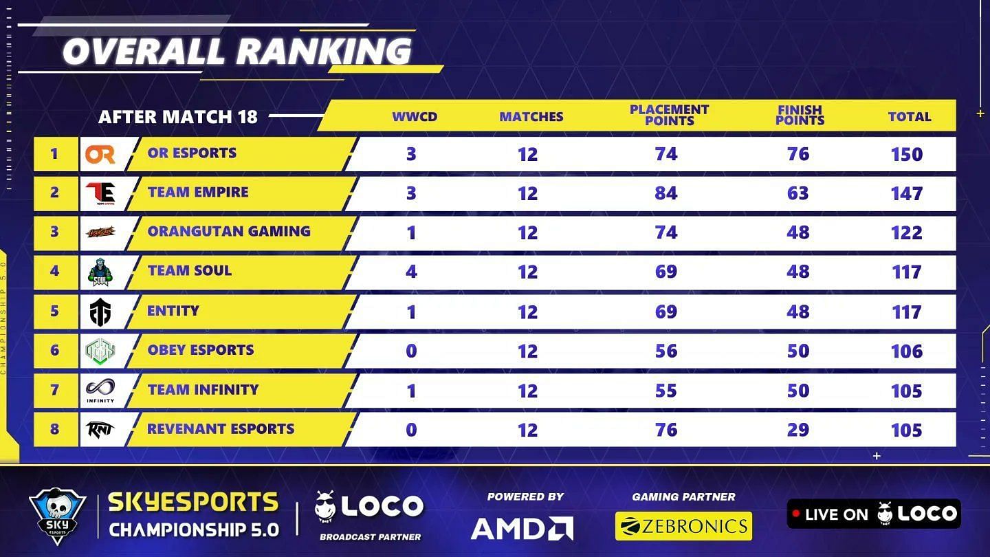 Entity Gaming secured the fifth spot on the table with 117 points, thanks to one Chicken Dinner. Obey and Infinity finished sixth and seventh with 106 and 105 points, respectively.