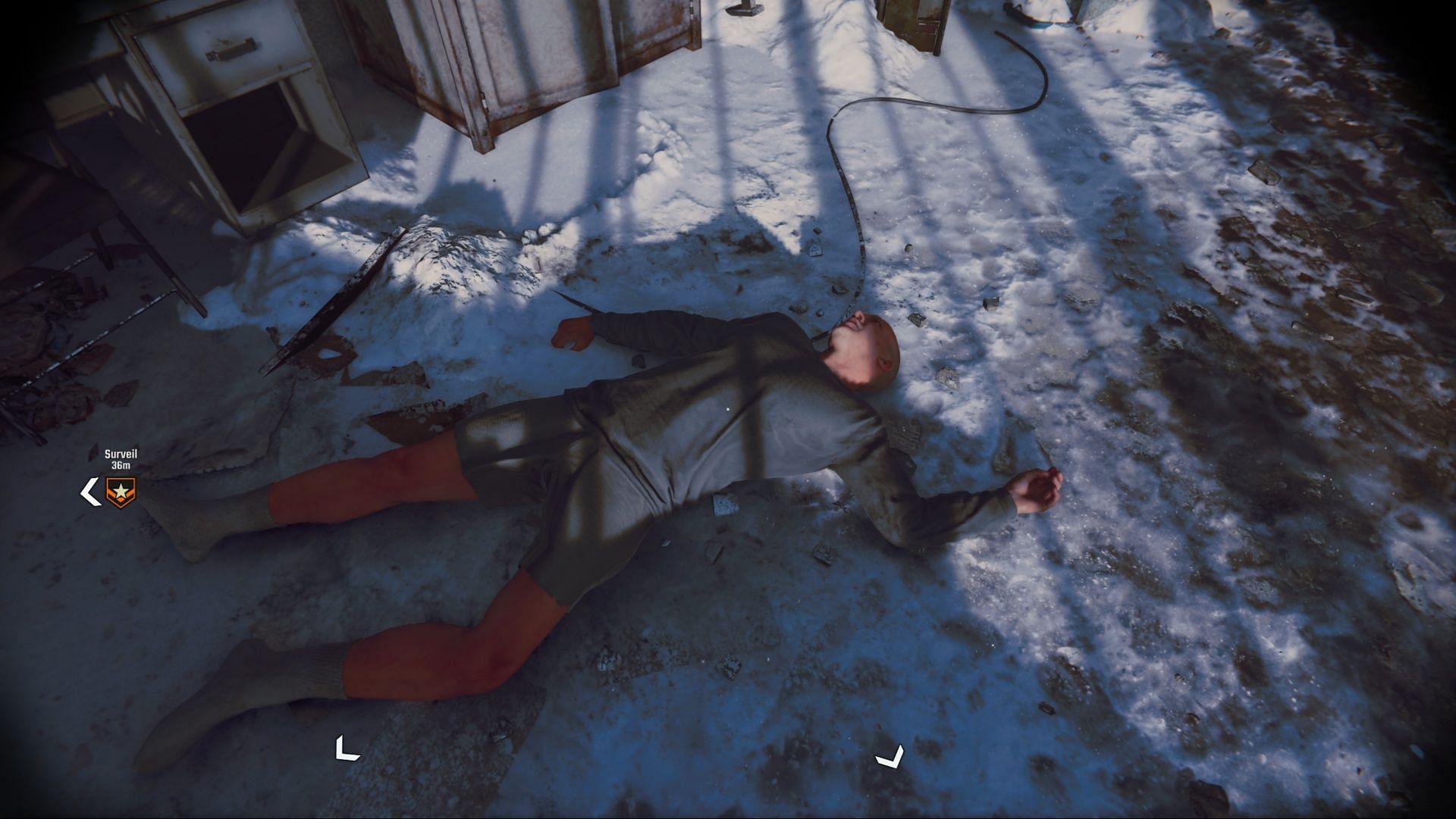 Start by heading left, where you’ll find a small building with a single guard. Eliminate him silently and proceed through the building to the other side.