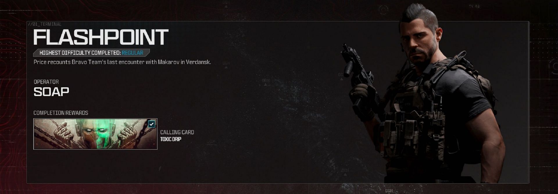 Upon completing the Modern Warfare 3 campaign mission 8 "Flashpoint," you will be instantly rewarded with a "Toxic Drip" Calling Card, irrespective of the difficulty level you played the mission on. As long as you complete it, you'll receive the reward.