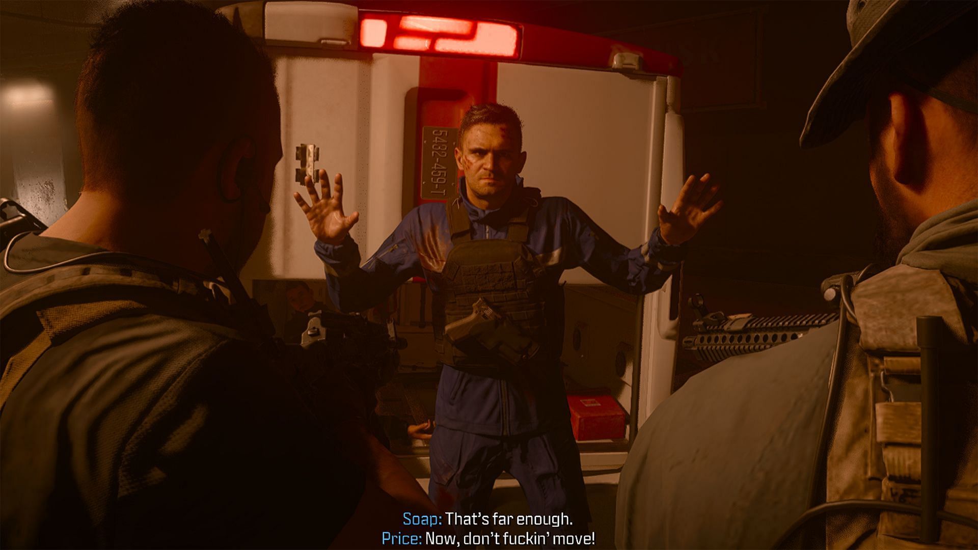 We are then shown a cutscene with Captain Price, Soap McTavish, and Corporal Burns as they drive to the stadium to contain the threat. However, Shepherd asks the team to bring back Makarov alive.