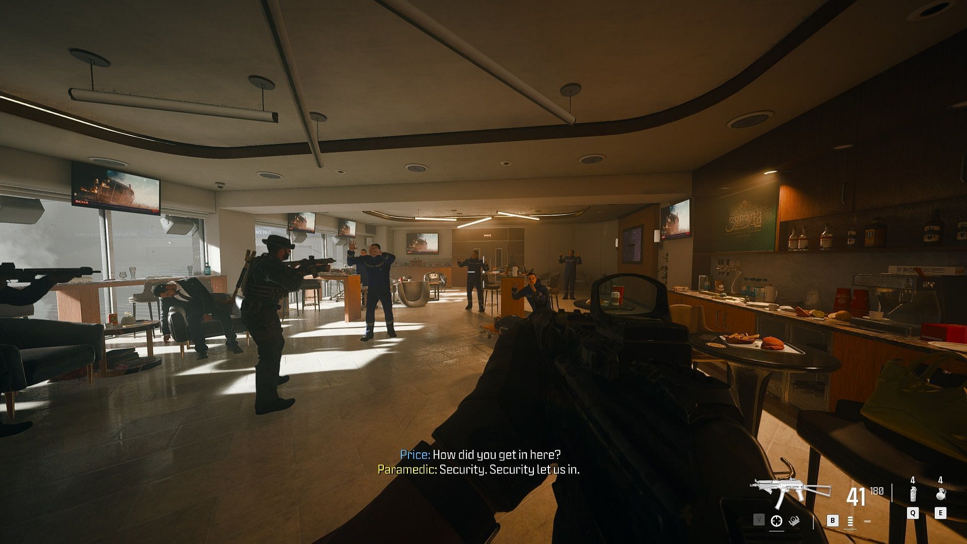 Reach the top floor, where you will find a locked door. Interact with it and Price will get it open with a crowbar. Follow him through the VIP lobby, and you will encounter some enemies pretending to be paramedics.