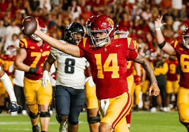 Jayden Maiava is an American footballer who plays for the USC Trojans as a quarterback. Standing at 6 ft 4 in (1.93 m) and weighing 220 lb (100 kg), Maiava wears the jersey number 14 for the Trojans.