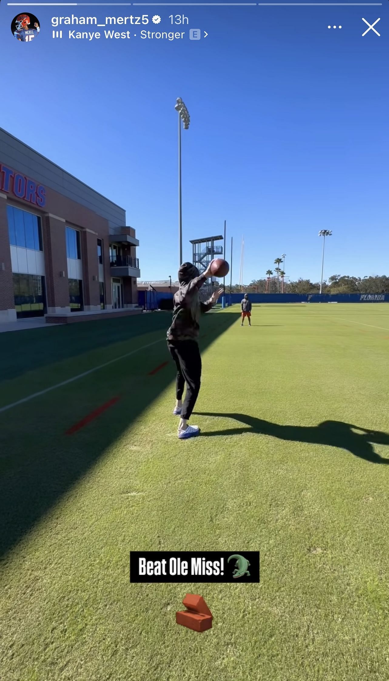 In an Instagram stories post on Friday, Graham Mertz, who has an NIL value of $853,000 (according to On3), posted a video of himself throwing the ball at the Gators’ training facility. The quarterback captioned the post with: