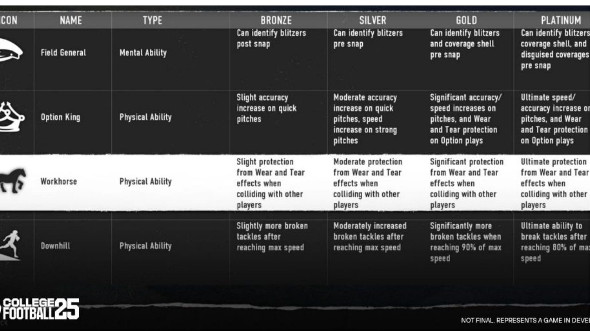 Understanding and mastering player abilities in College Football 25 will be crucial to getting the most out of your players during games. There are 80 abilities that are split into mental and physical abilities. Each trait is also divided into four tiers: bronze, silver, gold, and platinum. Each tier offers more of a boost to that specific trait.