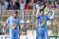 Yuvraj Singh (R) waves his bat and helmet after scoring century (100 rns) against Pakistan as his teammate Mahendra Singh Dhoni (L) looks on in the fifth and last One Day International (ODI) match at The National Cricket Stadium in Karachi