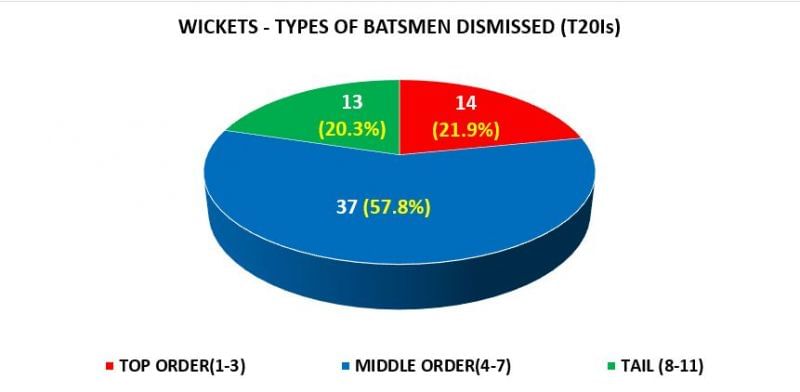 Rashid too has been successful at this, picking up 13 top-order wickets. But as expected, a major chunk of his wickets are middle-order batsmen.