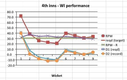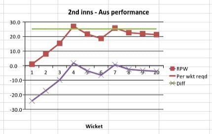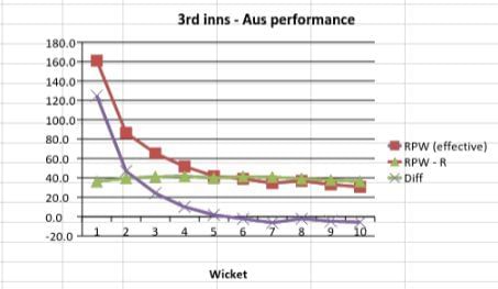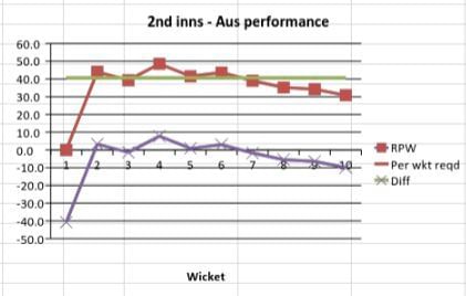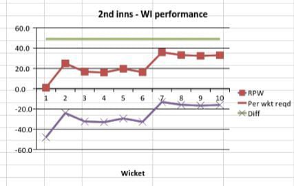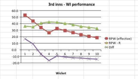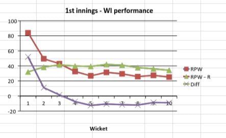 Australia, who required 45.3 runs per wicket to match the 1st innings total of WI, started off brightly and maintained an RPW that consistently stayed well above the required RPW. After a slight fall in the beginning, their RPW reached 78.2 (diff of 32.9) at the fall of the sixth wicket. A mini collapse after that meant that Australia did not quite consolidate their strong position. Nevertheless, with WI having to make up 5.2 runs per wicket, Australia were definitely in the ascendancy.