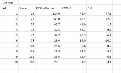 3rd innings – RPW (effective) – the runs per wicket factoring in the lead or deficit at the end of the match 2nd innings, RPW–R is the average runs per wicket (includes not outs) record for the last ten years leading up to the game for the team batting in the third innings, Diff – the difference between RPW and RPW-R.