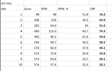 2nd innings – RPW – runs per wicket and the runs per wicket required – the average runs per wicket the team needs to get to match the 1st innings score of the opposition, Diff – the difference between RPW and the runs per wicket required.