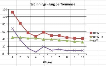 England’s advantage was to prove extremely crucial. They had a terrible start to their 2nd innings and lost wickets in a heap. Their RPW at the fall of the 6th wicket was still only 29 (despite the lead of 9.9 per wicket). The RPW fell away even more to 25.6 at the fall of the 9th wicket but a vital 51-run stand for the last wicket moved the RPW to 28.1 which was not too far from their RPW-R (31.2).