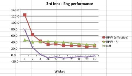 After an early wicket, Australia set about repairing their innings well. Their RPW at the fall of the 6th wicket was only 5.1 behind England’s at the same stage. However, a late collapse saw their RPW plummet to 30.8, a deficit of 9.9.
