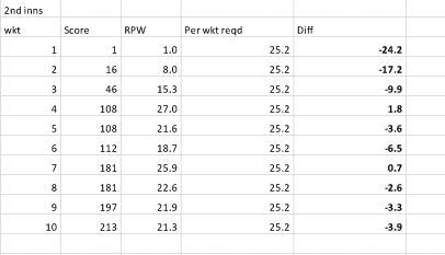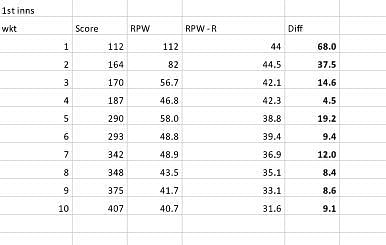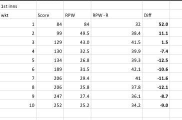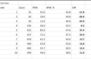 Australia’s performance in the 1st innings makes for an interesting analysis. They started poorly and their RPW fell way behind their RPW-R so much so that the difference (diff) was -36 at the fall of the 3rd wicket. A brief recovery was followed by a huge partnership that moved them into the ascendancy. The RPW at the fall of the 5th wicket was 85 and the diff was 37.4. Despite a few quick wickets at the end, their RPW was comfortably above the RPW-R at the end of the innings (diff of 11.0).
