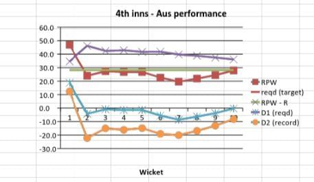 Australia, armed with a commanding lead, played well enough to move further ahead in the contest. Although they lost wickets at regular intervals, their RPW (effective) was extremely high (68.4) when the fifth wicket fell. Pushing for a win, Australia declared five down for 170 with an RPW (effective) of 34.7. This performance, however, was well above the RPW–R in the preceding ten years. The difference (Diff) was consistently over 20 and ended on +6.3 suggesting a relatively stronger position for Australia going into the fourth innings.