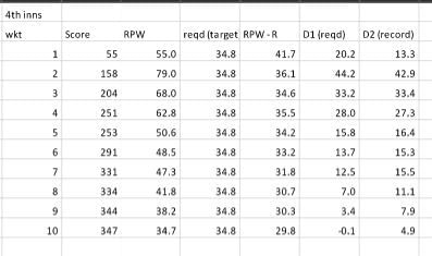 Right from the beginning, Australia had an RPW that was well ahead of their RPW – R leading up to the game. The difference (Diff) consistently remained over 50 and reached a peak of 74.3 at the time the fourth wicket fell. Australia declared seven down and left India requiring a massive 57.4 runs per wicket to establish parity. (Because the effective runs per wicket required for India does not change, the table of the 1st innings shows the last few wickets falling at the same score (574). However, Australia declared 7 down.