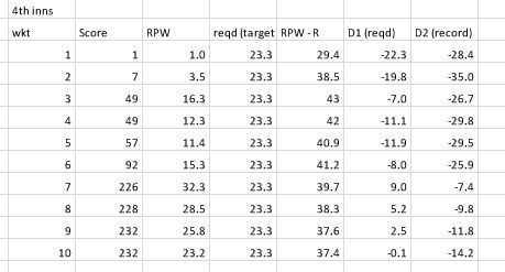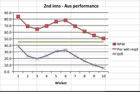 Australia, who required 45.3 runs per wicket to match the 1st innings total of WI, started off brightly and maintained an RPW that consistently stayed well above the required RPW. After a slight fall in the beginning, their RPW reached 78.2 (diff of 32.9) at the fall of the sixth wicket. A mini collapse after that meant that Australia did not quite consolidate their strong position. Nevertheless, with WI having to make up 5.2 runs per wicket, Australia were definitely in the ascendancy.