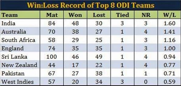 Pakistan's ODI team has the worst record among the top 8 ODI teams, barring West Indies, over the past 4-year period since the 2011 ICC World Cup. In all ODIs played among the top 8 teams since the last World Cup, Pakistan's W:L ratio of 0.71 is better than only that of the West Indies.