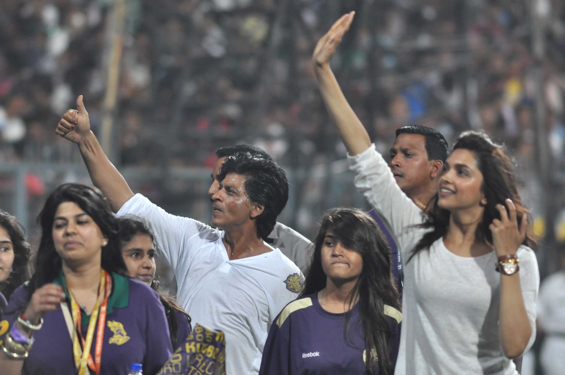 Bollywood megastar Shahrukh Khan and actress Deepika Padukone going around the Eden Gardens after Kolkata Knight Riders’ victory over Delhi Daredevils in the sixth Indian Premier League opener in Kolkata on April 3, 2013. (Photo: IANS)