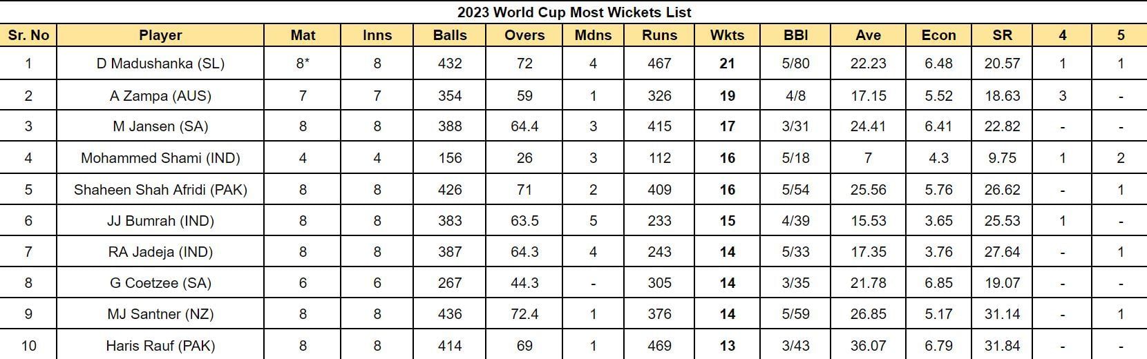 Dilshan Madushanka has reached the top of this list after his impressive bowling performance against Bangladesh. The left-arm pacer has dismissed 21 batters so far and has maintained a bowling average of 22.23.