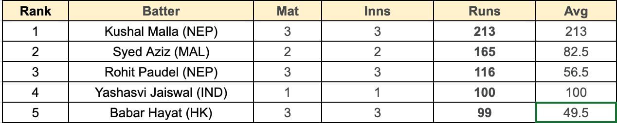 Nepal batter Kushal Malla is leading the batting charts with 213 runs at an average of 213 in three innings. Malaysia's Syed Aziz smacked 165 runs from two innings to occupy the second rank.