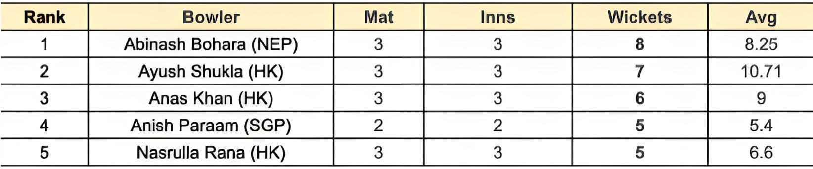 Nepal medium pacer Abhinash Bohara continued to stay on top with eight scalps from three innings. Hong Kong medium pacer Ayush Shukla rose to the second rank with seven scalps from three matches.