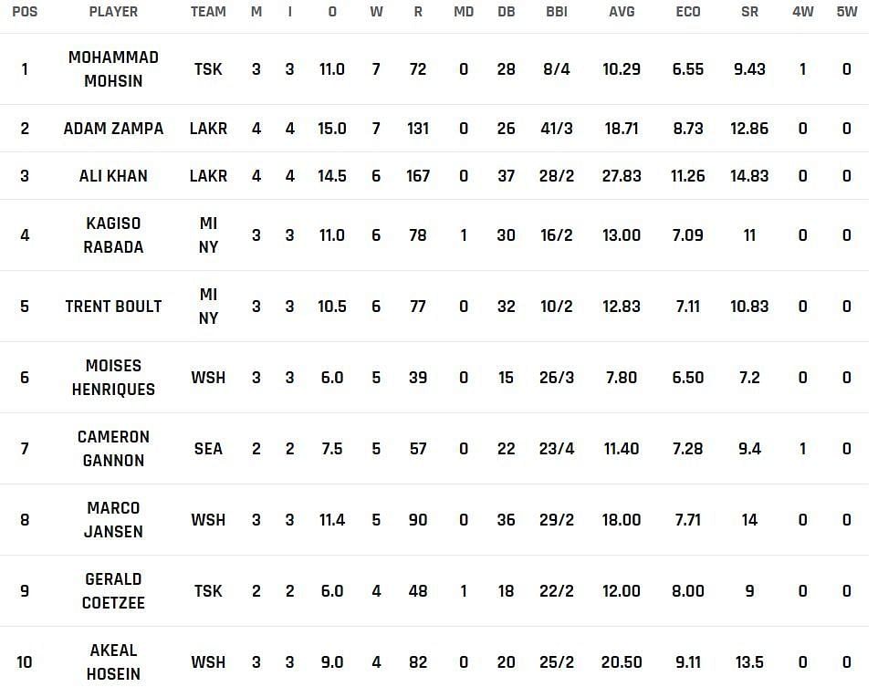 MLC 2023 most wickets list - Mohammed Mohsin to stay on top of the wickets list