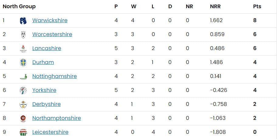 In the North Group, Derbyshire celebrated their first win of the season, climbing to the seventh spot in the standings with two points and an NRR of -0.758. Leicestershire suffered their fourth consecutive defeat and find themselves at the bottom of the group's points table.