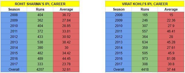 Rohit has been very consistent in the IPL since the start and he has scored at least 350 runs in every season barring the tenth edition. Kohli, on the other hand, had a slow start to his IPL career as he was a bit inconsistent in the tournament over the years.