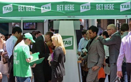 People stand outside a tent set up as a betting booth for the Melbourne Cup horse race in Sydney on November 6, 2012. Jockeys are forbidden from betting on any horse, while betting on a horse in the same race is one of the “gravest breaches” of Australian racing laws.