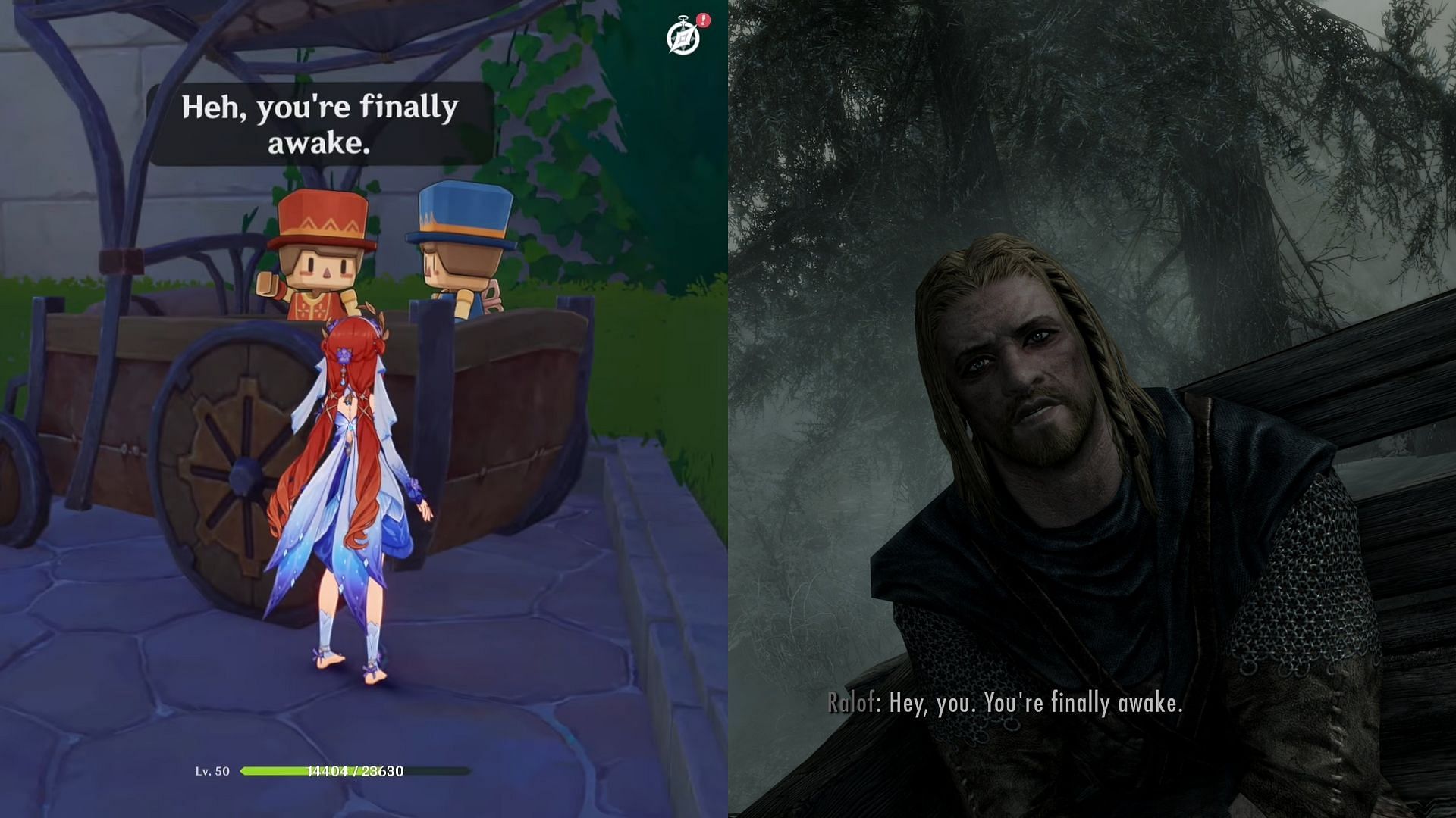 "Hey you, you're finally awake." are the legendary words spoken at the beginning of the Elder Scrolls V: Skyrim. This dialogue has been immortalized as a meme used in the gaming community. This dialogue in Genshin Impact is said by one toy to another inside a carriage as a reference to the meme.