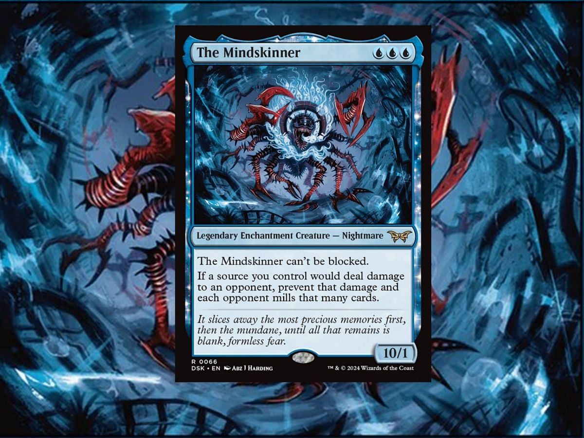 My personal favorite that I’d actually run in a deck is probably The Mindskinner. One of MTG Duskmourn’s best Commanders, it’s a 10/1 that can’t be blocked. I would 100% run this with something to make it indestructible, just to avoid it being Lightning Bolted. If a source you control deals damage to an opponent, prevent that damage and each opponent mills that many cards.