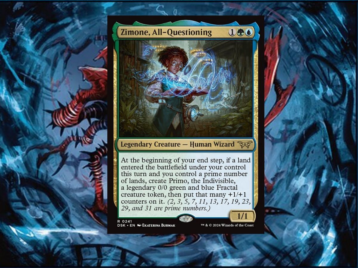 Zimone, All-Questioning is one of my favorite/least favorite Commanders in MTG Duskmourn, while also being one of the best. I don’t care for her because she involves Math, which, let’s face it, all of Magic does. But specifically Prime Numbers? Hard pass for me. However, the card does show all the Prime Numbers you could possibly need to know for this card.