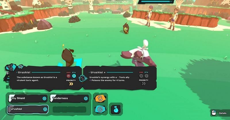 In the image above, the Urushioi move will Poison the enemy for 4 turns if the partner Temtem is a Toxic Type. If the partner is some other type, the effect is not gained. Synergies also apply to items or "gear" that your Temtem can hold during battle.