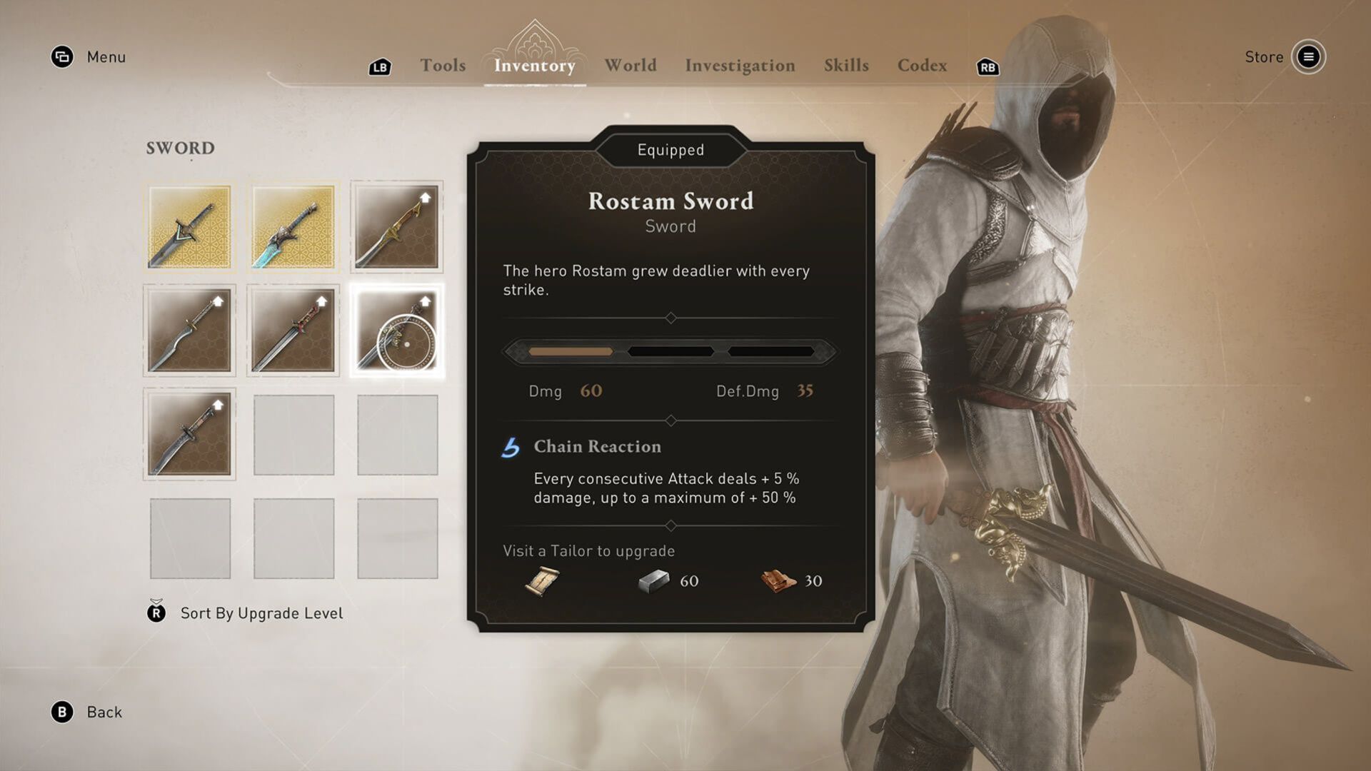 After unlocking the tool upgrade feature in the bureaus, Ibn Musa will provide you with schematics consisting of 60 units of steel and 30 units of leather.