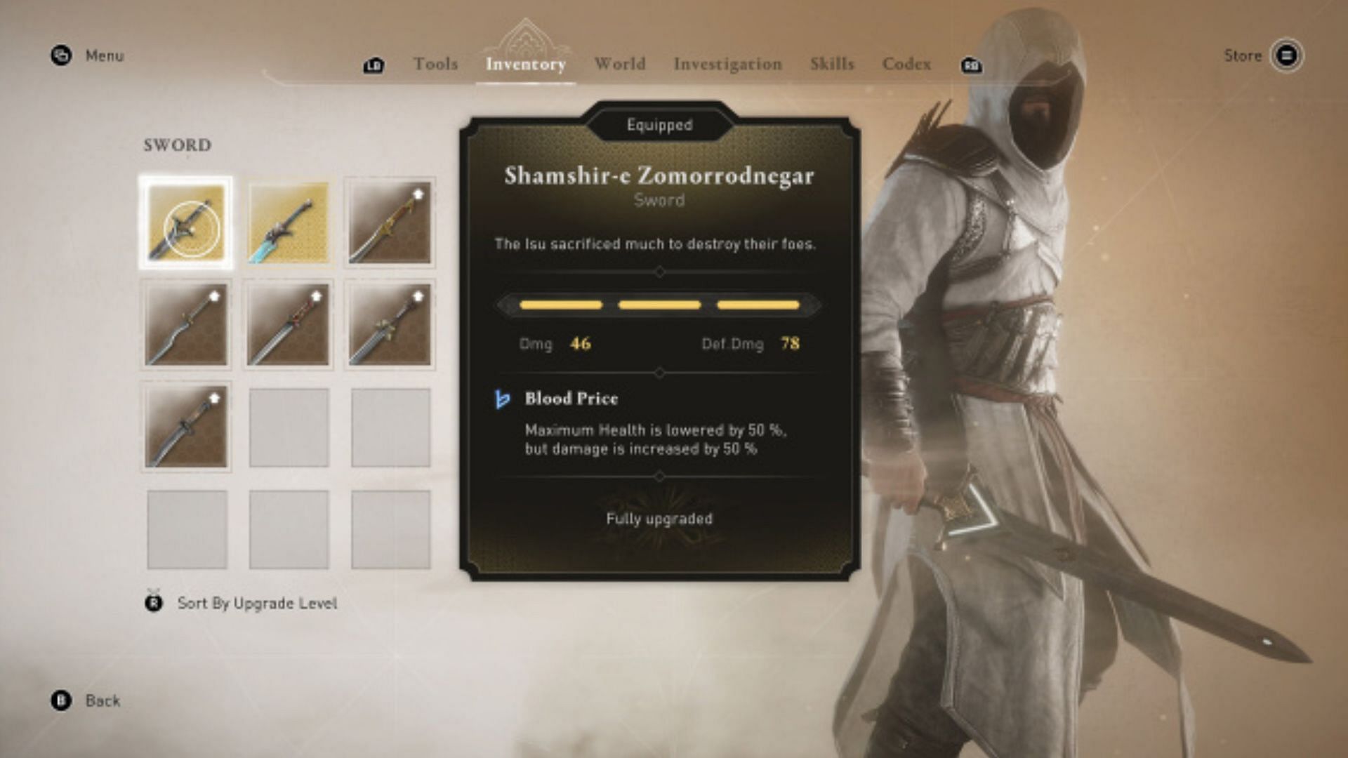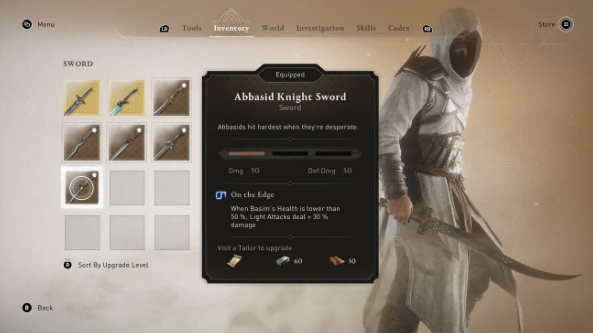 When Basim's Health falls below 50%, Light Attacks inflict an additional 30% damage. The stipulated damage values for this sword are: