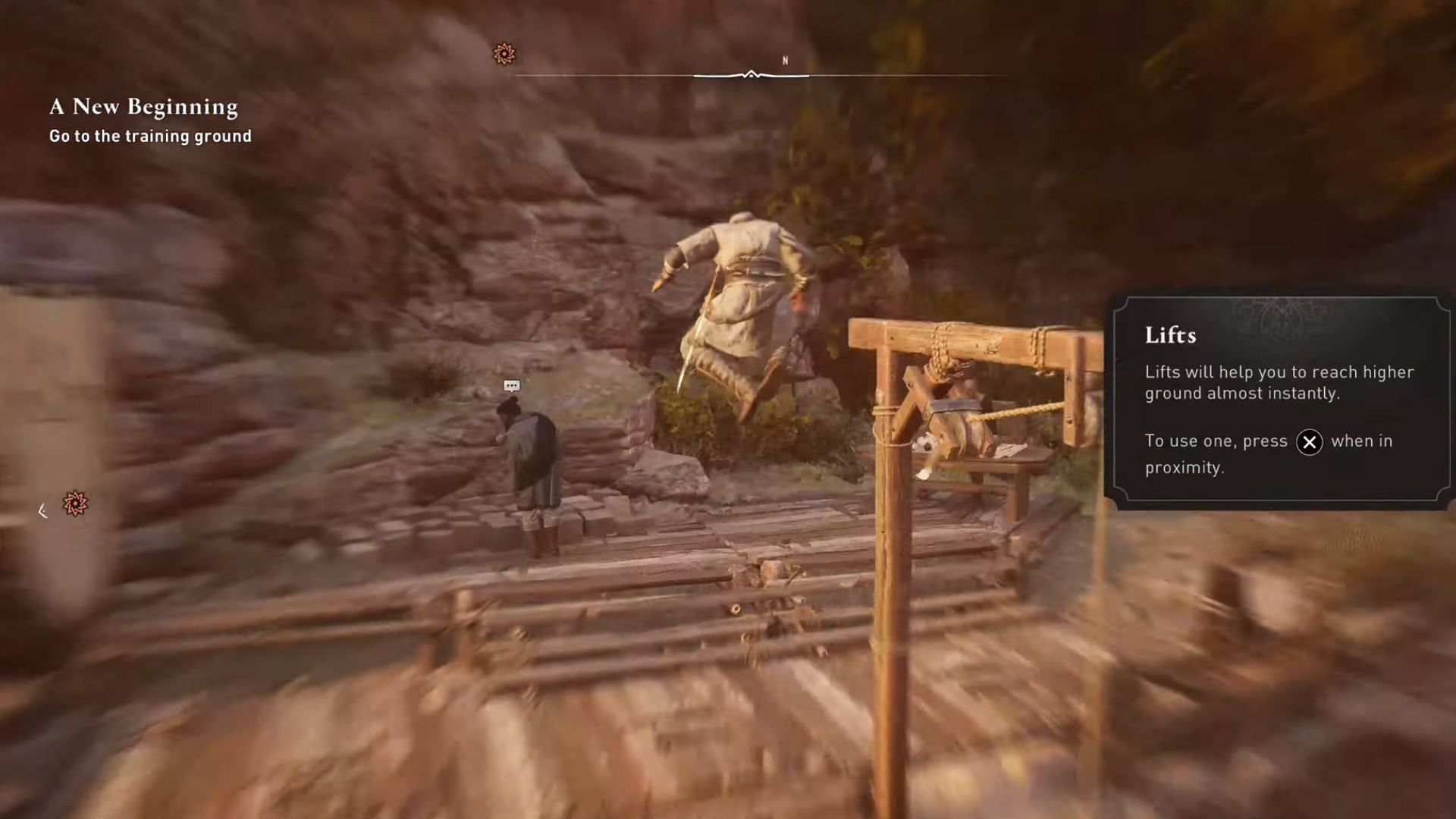 Along the way, you have the option to interact with an Assassin, but it is not mandatory. This is a secondary tutorial that will teach you the basics of knife throwing. The next step is to continue to the training grounds and climb the towering cliffs near the waterfall.