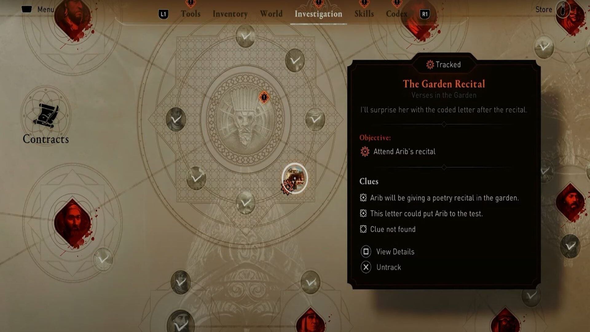 Stealthily take out the guards while searching for the strange letter. You can find it on the ground floor of the building using your eagle vision. The letter reads, "After the honey drips from her lips, Al-Thal'lab leaves the garden and follows the mouse."