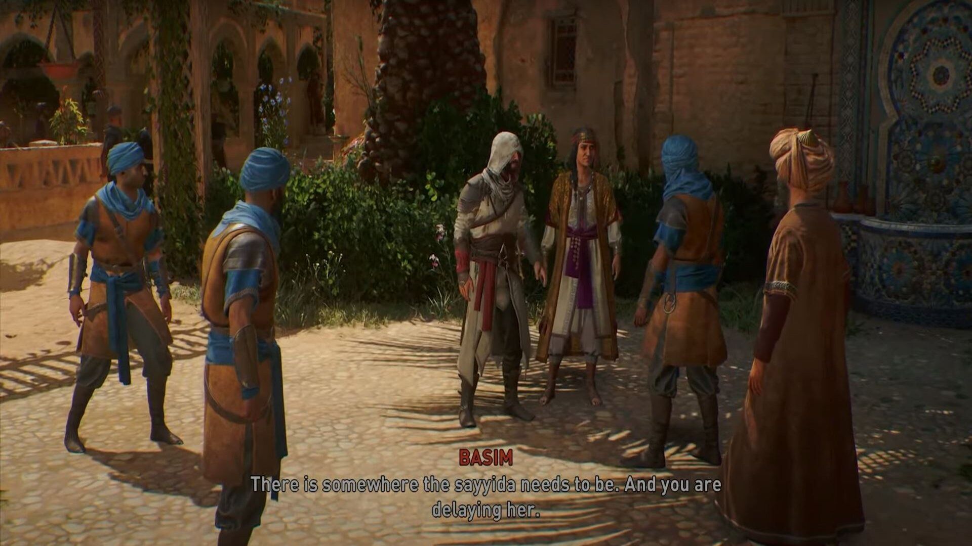 During the cutscene, you and Arib will be approached by the man you meet in her house. He will ask his guards to detain the poetess, but Basim offers to help her. Defeat the guards with your skills. You can check out this guide to learn more about Assassin's Creed Mirage's combat.