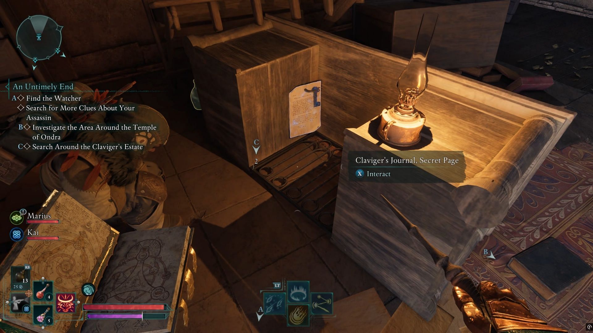 Head back down, and go to where Marius is squatting, next to the Claviger’s overturned desk. There’s a key here, and a Secret Journal Page. Turns out, the Claviger was working with the Rebels the whole time! The key will let you into a hideout in the Temple of Ondra.