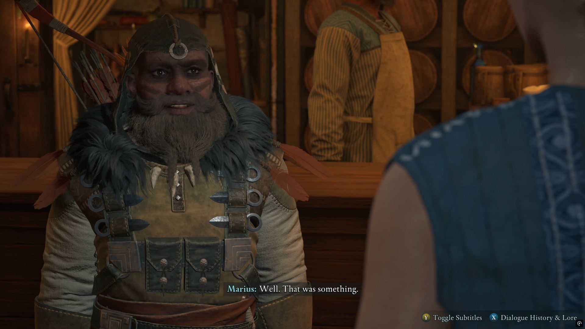 Head to the bar when you’re ready, and you’ll have a small chat with Marius. The quest marker will take you right to him. However, he’s incredibly drunk and dealing with some other locals. Offer to step in, and try to keep things friendly, and point out that you have the Emperor’s ear. They’ll leave.