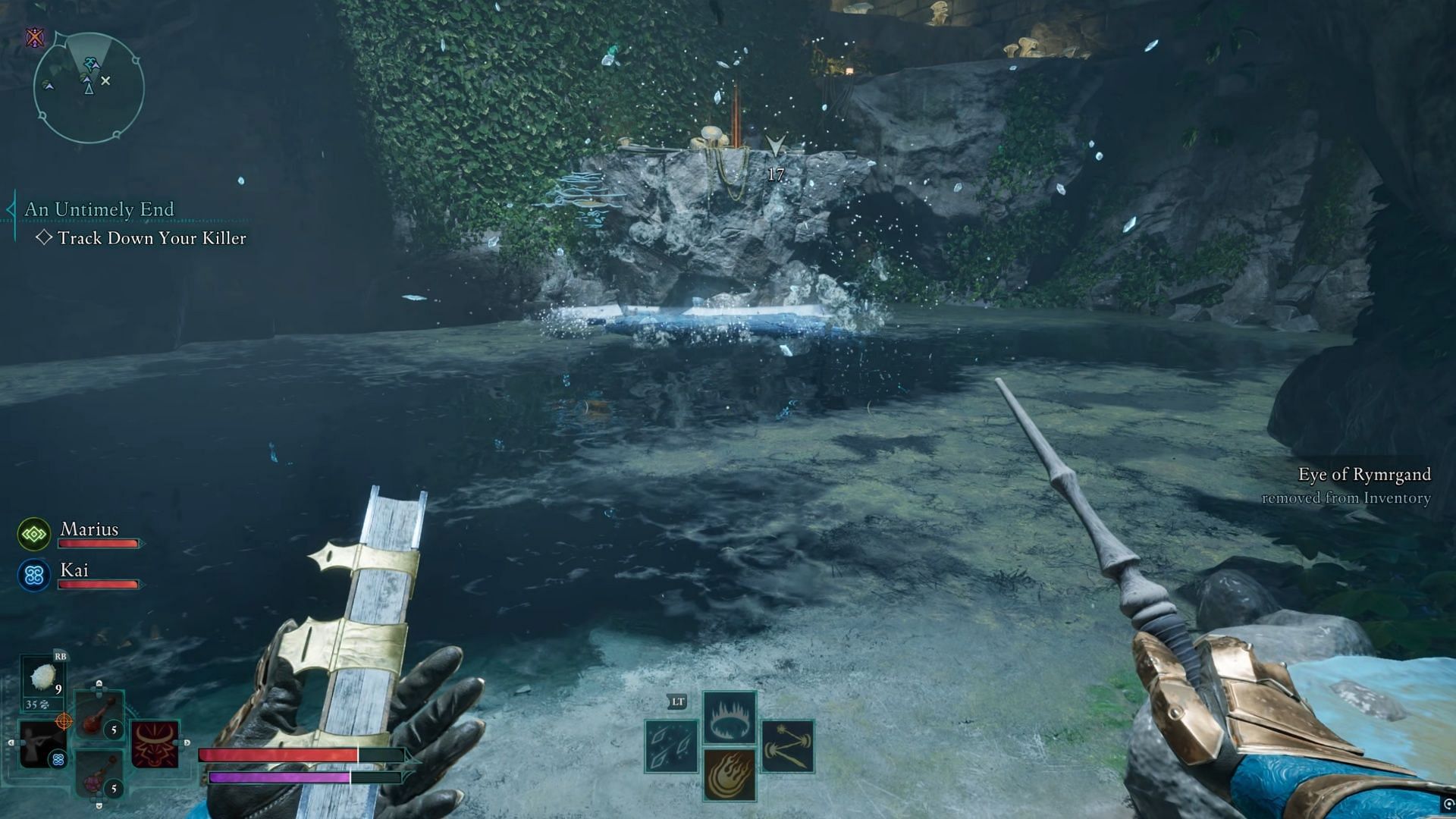 You’ll need to make some ice on the water again, so cast the Blizzard spell, or throw the item you find along the wall - it will create ice. Conveniently, there’s one as soon as you head into this area - Eye of Rymrgand. Climb up, and once again, return to the path. You’ll find some water, with an orange-glowing quest item up on a spot too high to reach.